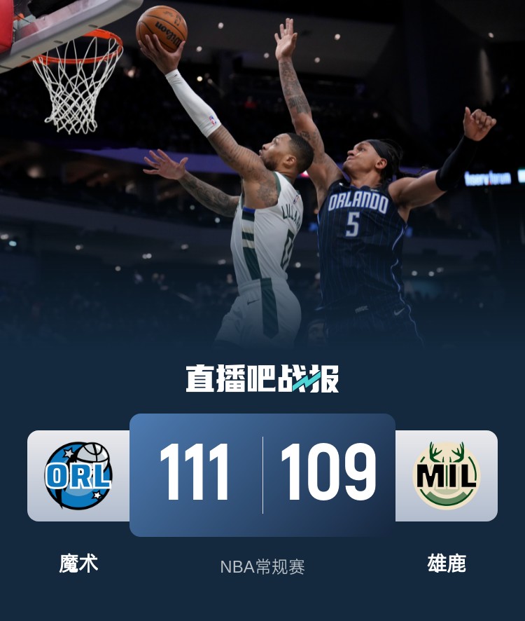 比赛开始,魔术上来就连中4记三分打出不错开局,雄鹿进攻端靠字母哥和利拉德苦苦支撑,但魔术外线继续发炮首节命中8记三分领先14分,次节小凯文-波特接连三分追分,但科尔-安东尼连续送助攻,魔术替补也能给出回应守住十几分领先,半场魔术继续领先13分。下半场,利拉德外线找到手感连续3记三分一度追到个位数分差,但科尔-安东尼里突外投再强势回应,三节魔术依然领先14分,末节字母哥接连攻筐,普林斯接连3记三分命中,雄鹿13-0追到仅剩2分,但班凯罗两罚加三分回应稳住两球以上领先,波普关键大帽后魔术挑战成功拿回球权,安东尼失误后利拉德绝杀三分不中,最终魔术111-109力克雄鹿,终止5连败同时终结对手4连胜。