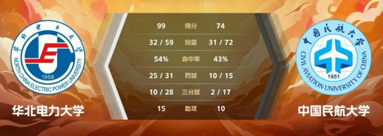第四节,魏丁宜再中三分,中国民航一度将分差迫近到个位数,但此后却突然哑火,华北电力连投带罚轰出9-0的攻击波稳住局势,蔡园园反击艰难止血,华北电力持续发力继续扩大领先,周津伊和黄宇轩各自内线得手,最终,华北电力大学99-74轻取中国民航大学,获得胜利。