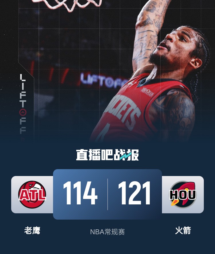 此役一上来火箭内外结合迅速占优,杰伦-格林连投带罚不断取分,末段老鹰进攻乏力未能及时回应,首节结束时火箭领先7分,次节回来,火箭延续火力轰出12-0攻击波,双方分差越拉越大,半场战罢,火箭已经领先17分。易边再战后双方你来我往火热对攻,但火箭总能给予回应,三节结束后火箭确立20分优势,末节上来,场上形势风云突变,老鹰一波20-4拉回悬念,小史密斯连中关键三分,老鹰连中三分紧咬比分,范弗里特连投带罚守住胜果,最终火箭拒绝逆转121-114力克对手。