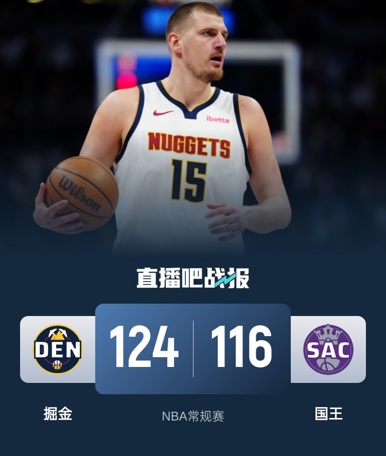 比赛上来,掘金先拿五分取得领先,国王此后虽然咬住比分却一直没能获得反超机会,不过次节仅一分半的时间国王就连进三个三分球迅速反超,好在是掘金及时稳准阵脚,半场结束时他们还领先8分;下半场回来,掘金继续占据场上主动权并将分差拉开到两位数,国王虽然能将分差追到个位数,但是却无法逆转比赛,最终掘金力克国王,终结后者三连胜的同时也止住了自己的四连败。