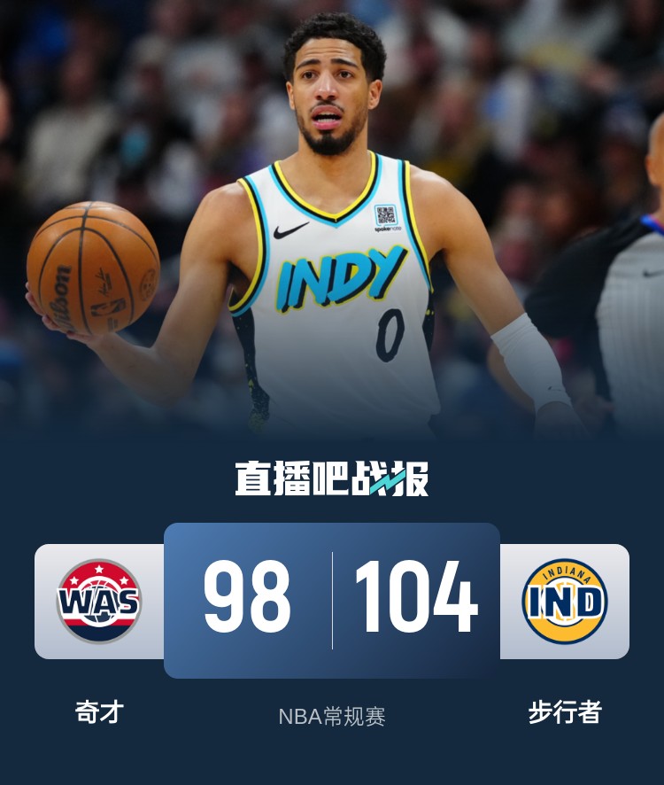 上半场,双方开场短暂相持,奇才内外开花很快取得两位数领先,但次节突然哑火,步行者大举反击轰出14-2的攻击波迅速迫近比分,奇才连造杀伤稳住局势,半场战罢两队战成48平。下半场,奇才占得先机再获两位数领先,步行者多点开花还以颜色,末节步行者持续发力取得领先,奇才后劲不足,苦苦追赶无果。最终,步行者104-98力克奇才。