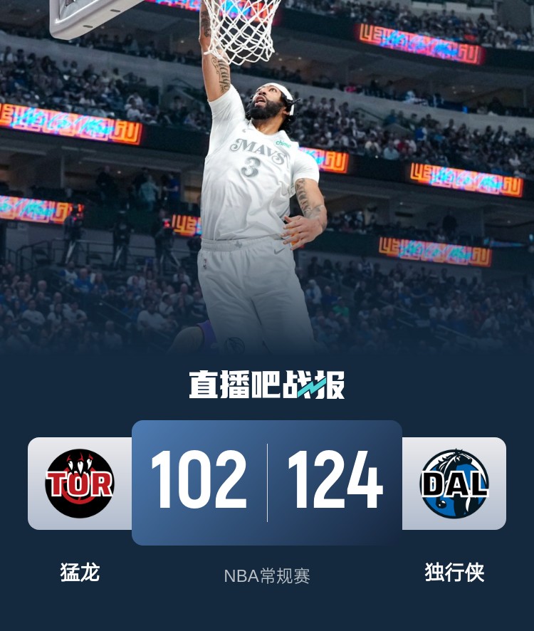 首节之争独行侠在和对手拉锯大半节时间后迅速接管比赛,他们末段在浓眉哥连续拿分中送上一波17-7的攻势拉开两位数分差;次节他们攻防两端完全压制对手,防守端仅让猛龙拿到13分,进攻端则爆砍31分,浓眉哥上半场贡献12+7+7+6帽的完美全面数据帮助独行侠半场拿到28分的领先。休息归来独行侠稳定输出牢牢控制着两位数的领先,浓眉哥不到一节的时间拿到12分6篮板2助攻势不可挡;大比分领先后独行侠也逐渐撤下主力进入练兵,局面也没有发生太大变化。最终,独行侠主场大胜猛龙结束3连败。