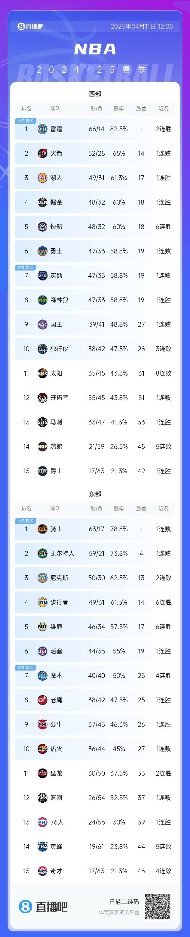 目前,快船(48胜32负)排名西部第五,勇士(47胜33负)位列西部第六,灰熊和森林狼都是47胜33负,分列西部第七和第八。