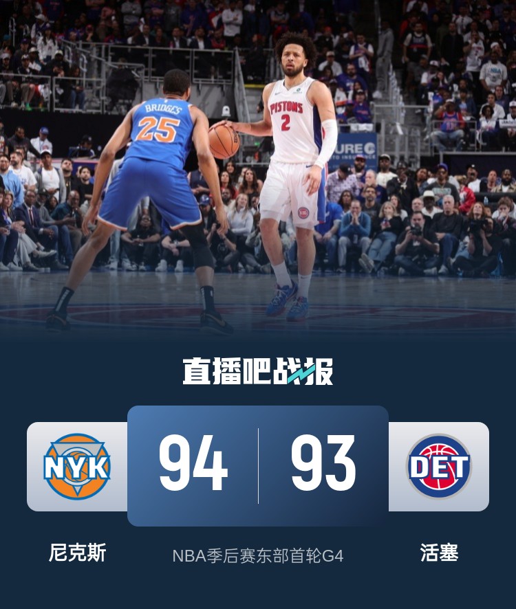比赛开始,双方上来都通过内线开局,随后哈特和布伦森、麦克布莱德外线连发4炮一波14-4攻击波建立主动权,首节尼克斯领先10分,次节双方命中率都有下降,打了4分多钟各自仅得4分,布伦森撤步三分打破僵局,但活塞小阵容突然打出9-0半场追到差7分。下半场,唐斯上来4犯,活塞顺势轰出12-2攻击波反超比分,哈特、唐斯和布伦森连续3记三分止血,但康宁汉姆连续突破强势能回应,布伦森受伤回更衣室,活塞12-3攻击波领先到7分,末节布伦森回归比赛并连续突破追分,随后三分一度助尼克斯追平比分,但施罗德和康宁汉姆连续中投稳住局势,唐斯连砍8分反超1分,康宁汉姆关键失误后绝杀中投也不进,小哈达威最后一投绝杀三分再丢,最终尼克斯94-93险胜活塞,大比分3-1夺赛点。