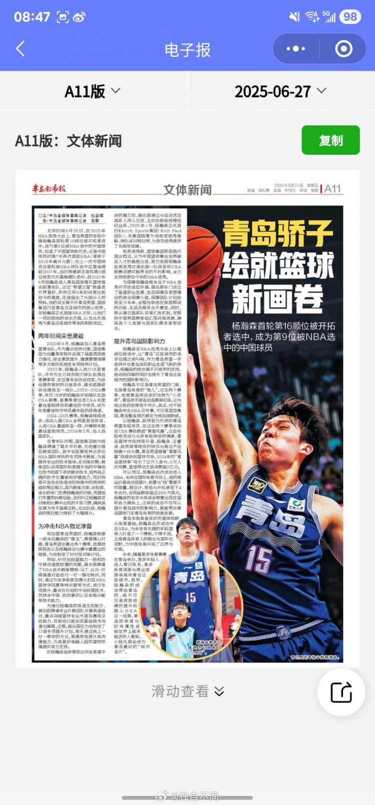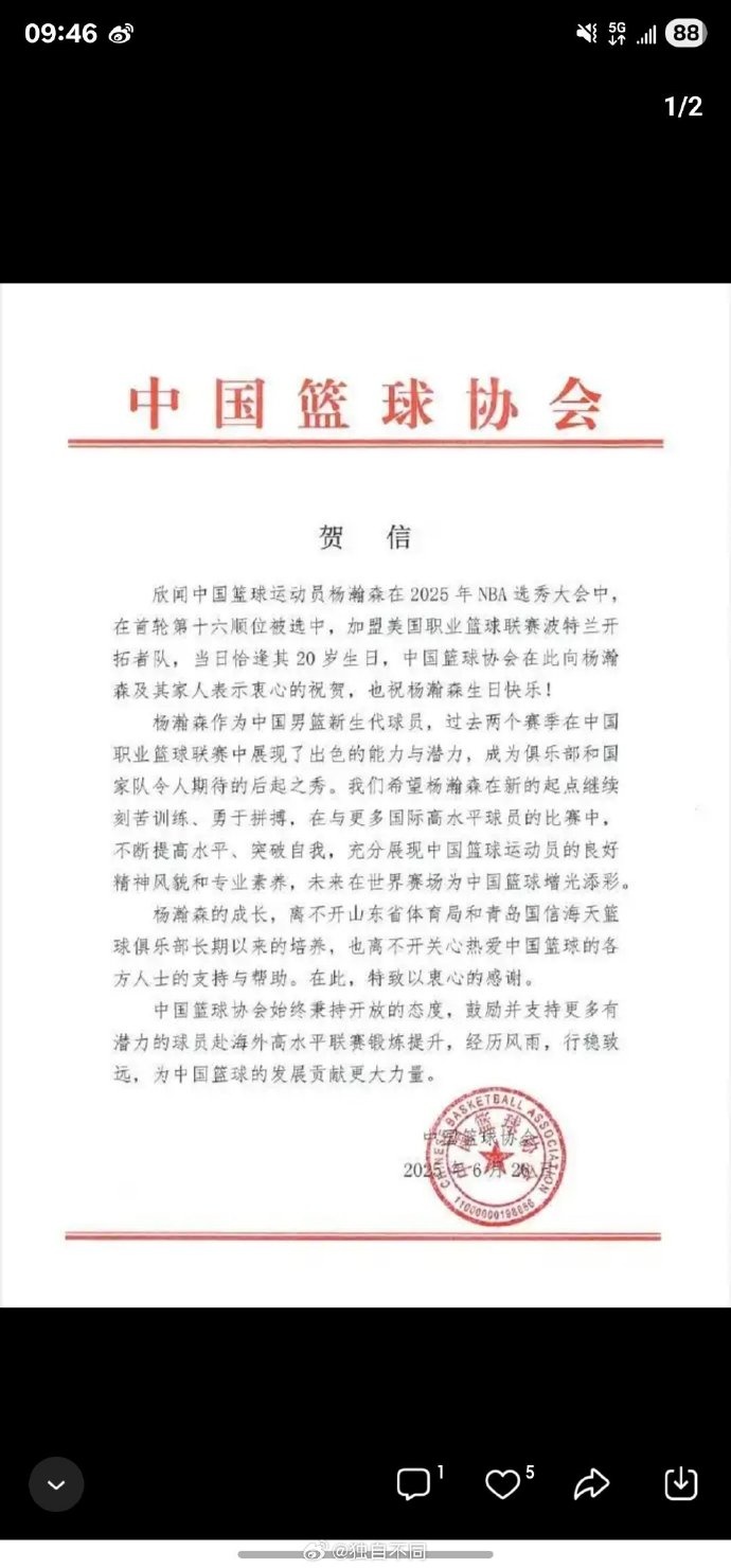 6月27日讯 今天,青岛男篮记者杜金城在社媒上谈到了杨瀚森在今年的选秀大会上被开拓者选中(16顺位)一事。