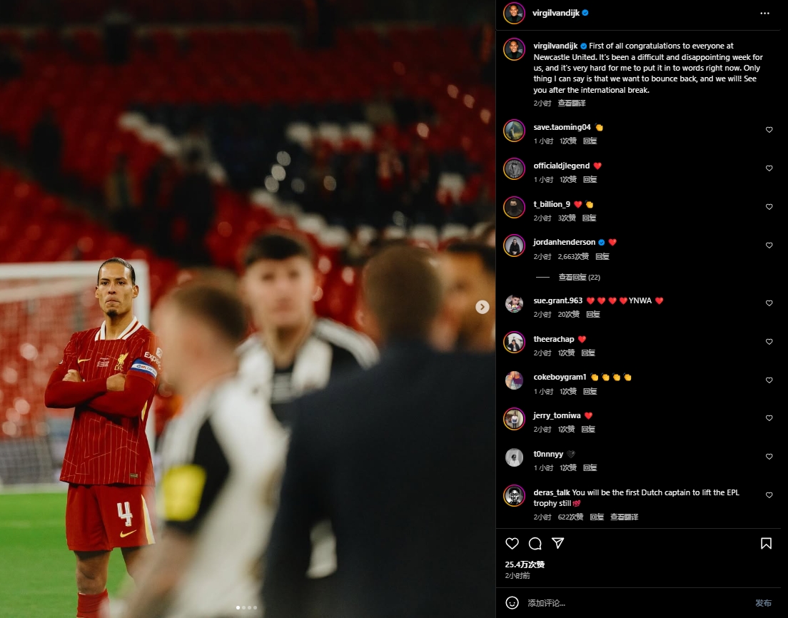 谈及失利原因,范戴克分析道:“比赛很艰难。纽卡斯尔充分发挥了他们的强项——虽然听起来像陈词滥调,但他们的对抗强度、犯规战术、定位球设计都做得很好。我们给了对手信心,让他们觉得今夜属于自己。我们的表现确实不够好,这让人非常失望和痛苦。”