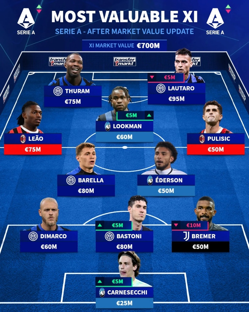3月26日讯 德转更新了意甲球员身价,并列出了该联赛最贵身价阵容,国米5人,亚特兰大3人,米兰2人,尤文后卫布雷默在列。
