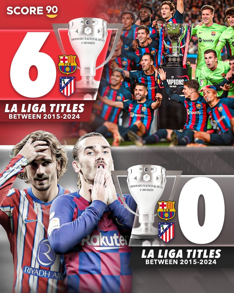 2019年7月,格列兹曼1.2亿欧加盟巴萨,效力巴萨两个赛季拿到1次西甲亚军,1次排名第三;同期马竞在20/21赛季获得西甲冠军。