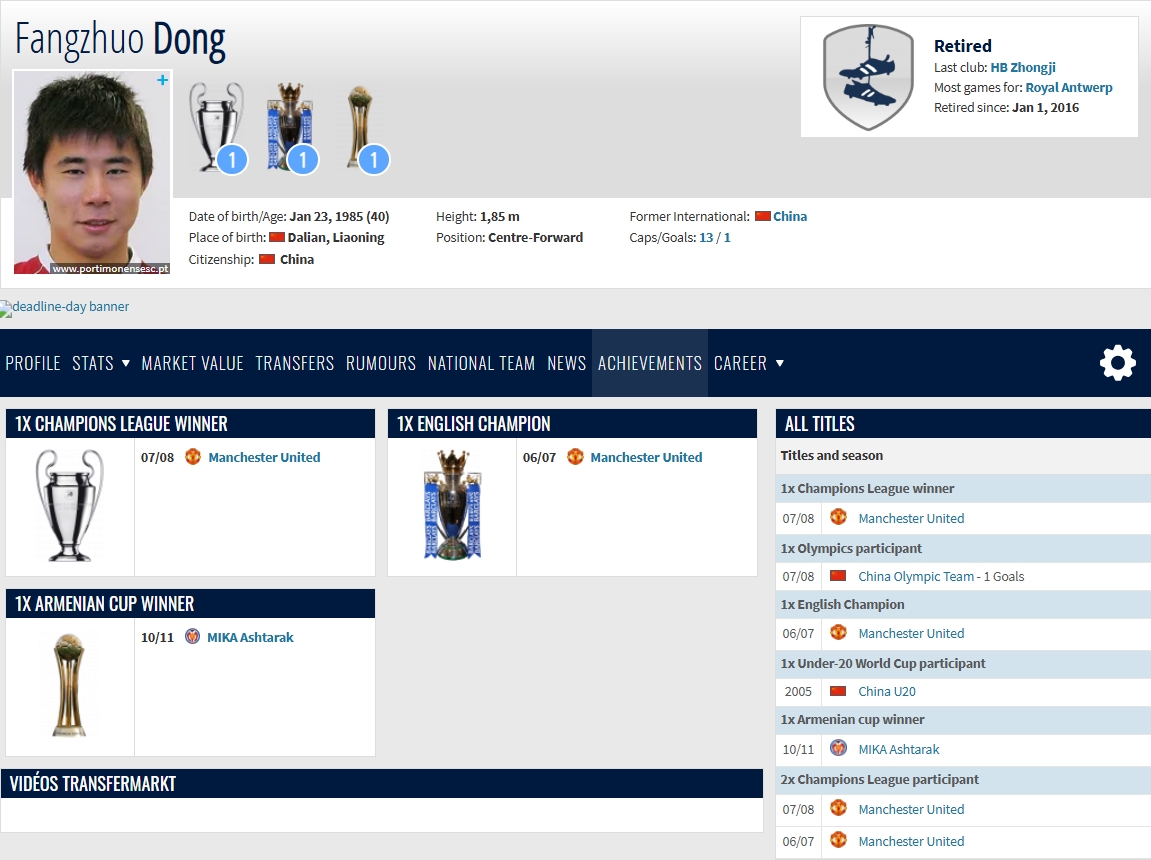 那么是哪名中国球员被英超官方认定为冠军成员呢?答案仅有可能是董方卓。在英超联赛官网数据库中,仅有7名中国籍球员在英超联赛有过出场,他们分别是:孙继海、李铁、郑智、蒋光太、董方卓、李玮锋以及李可。