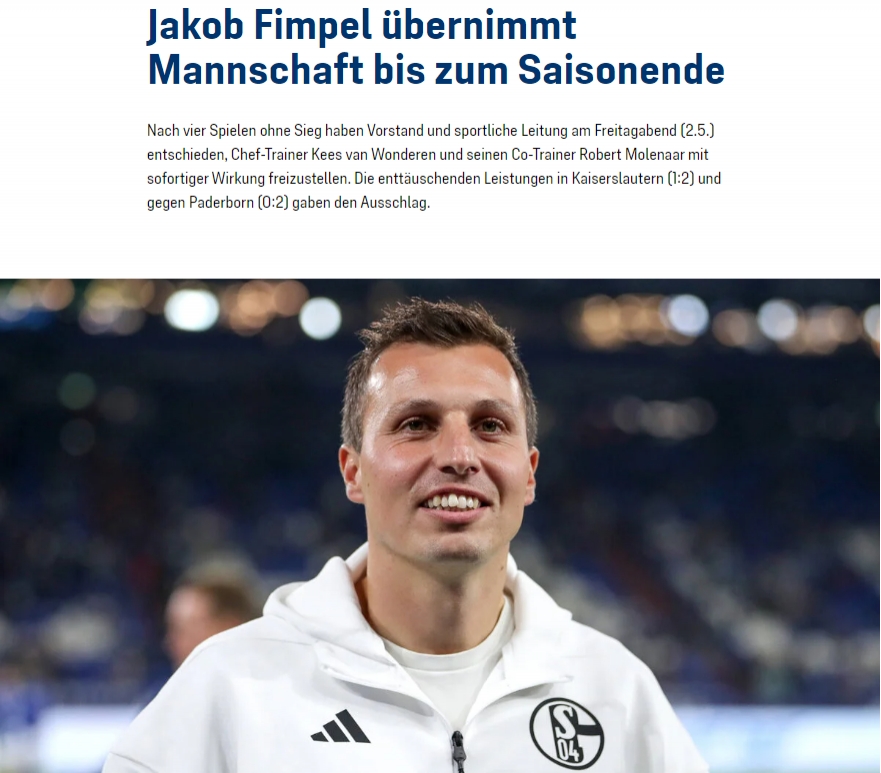 本赛季的德乙联赛还剩最后两场比赛,沙尔克官方表示U23主帅芬佩尔将作为临时主帅完成这两场比赛。在上半赛季的换帅过渡期间,芬佩尔已经带领沙尔克踢了两场比赛,他取得1胜1平的战绩。