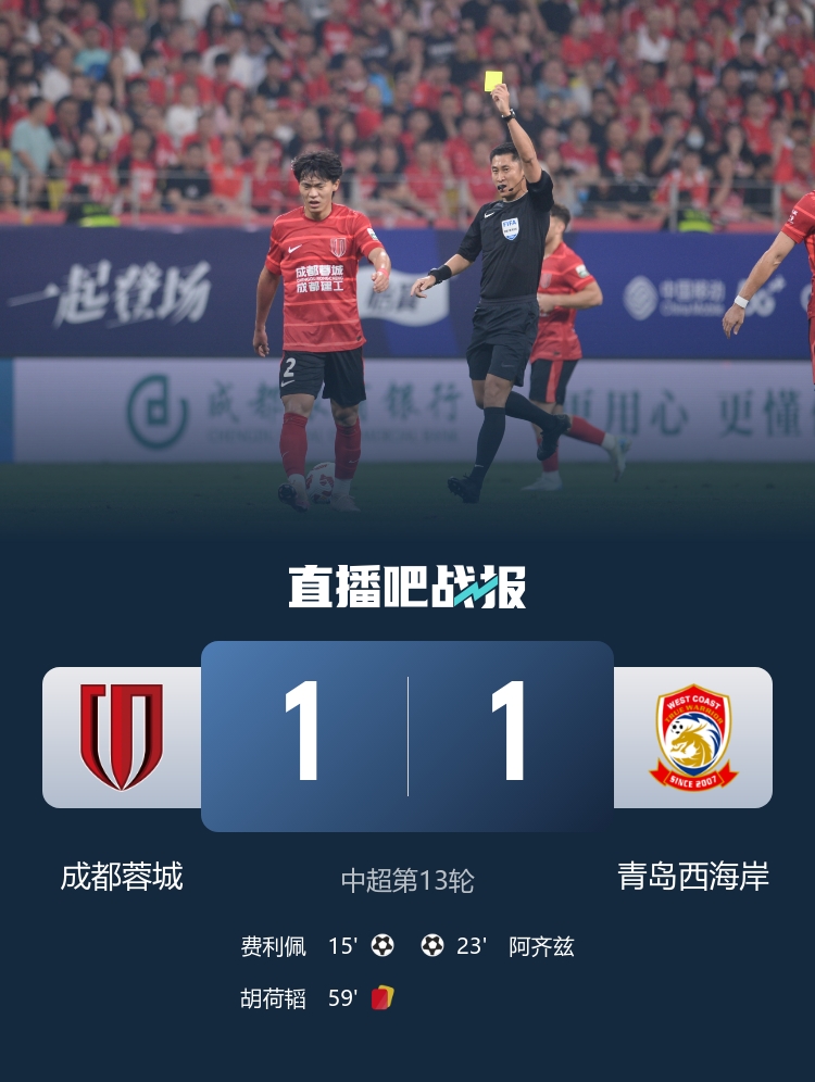 第23分钟,青岛西海岸任意球开出,成都蓉城禁区内兵荒马乱,阿齐兹凌空斩打穿周定洋小门后弹入网窝!1-1!青岛西海岸扳平了比分!↓