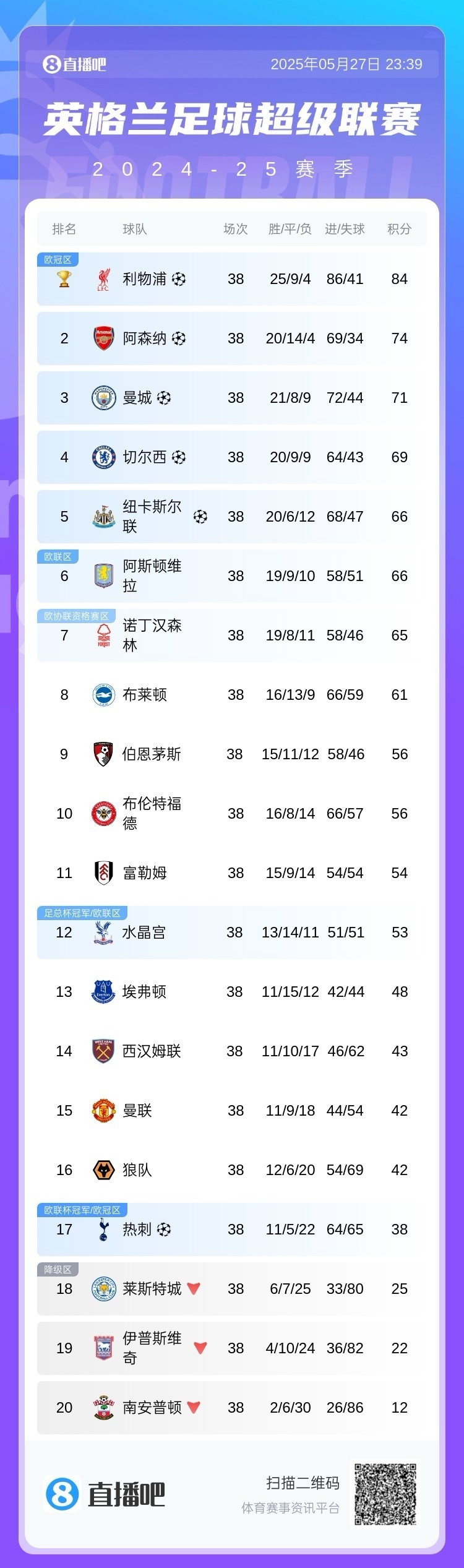 根据投票结果,Squawka列出本赛季英超联赛若无VAR误判情况下的积分榜,利物浦81分夺冠,阿森纳79分次席,曼城第三。诺丁汉森林将参加下赛季欧冠,纽卡踢欧联,维拉踢欧协联。