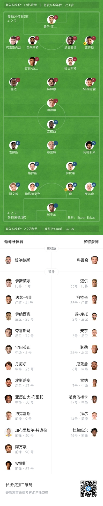 多特首发:1-科贝尔、4-施洛特贝克、9-吉拉西、10-布兰特、13-格罗斯、20-萨比策、23-詹、24-斯文松、26-莱尔森、27-阿德耶米、43-吉腾斯