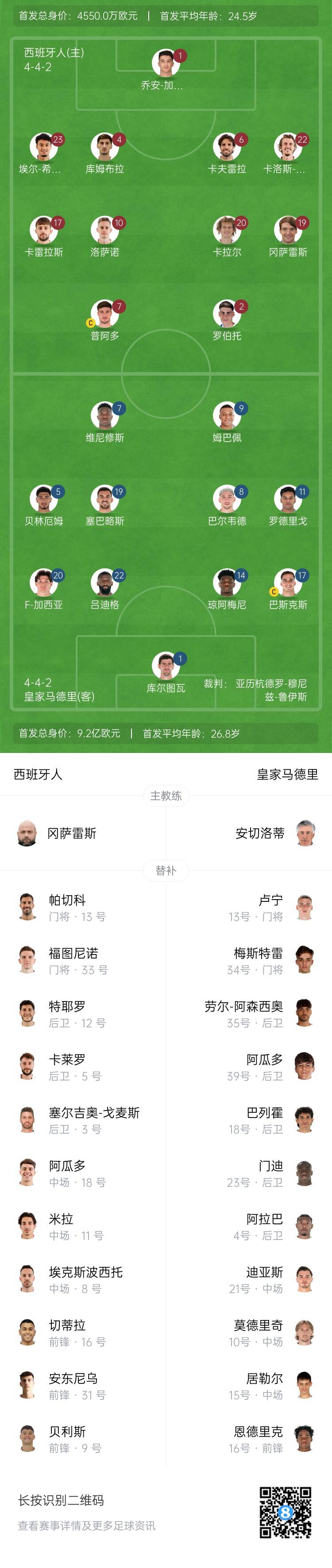 皇马首发:1-库尔图瓦、17-巴斯克斯、14-琼阿梅尼、22-吕迪格、20-弗兰-加西亚、8-巴尔韦德、19-塞巴略斯、5-贝林厄姆、11-罗德里戈、7-维尼修斯、9-姆巴佩