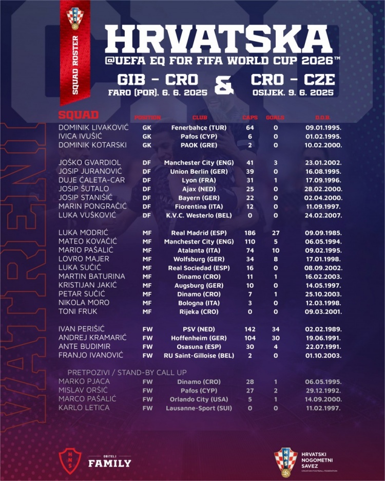 5月19日讯 克罗地亚将在6月份世预赛中对阵直布罗陀和捷克,克罗地亚队公布了6月国际比赛日的球员名单,莫德里奇领衔。克罗地亚6月国际比赛...